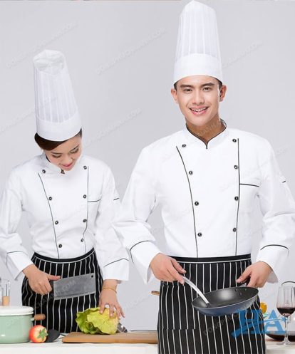 Mẫu đồng phục bếp với form áo thiết kế rộng rãi, tạo sự thoải mái cho người mặc, mẫu áo đồng phục bếp sử dụng chất liệu vải cao cấp, thấm hút mồ hôi hiệu quả. Đường cắt may tinh tế, cẩn thận trên từng chi tiết nhỏ thể hiện đẳng cấp đồng phục bếp nhà hàng – khách sạn.