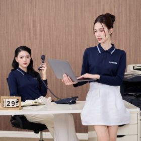 Đồng phục polo dài tay Samsung sở hữu gam xanh đen làm tông màu chủ đạo, mang đến cảm giác chuyên nghiệp và quyền lực trong môi trường công sở. Sắc màu trầm giúp tổng thể trang phục trông gọn gàng, tôn da và phù hợp cho cả nam lẫn nữ. Điểm nhấn viền trắng tại cổ áo và logo tạo sự tương phản tinh tế, giúp mẫu áo thêm trẻ trung, hiện đại và dễ phối cùng với các trang phục khác.