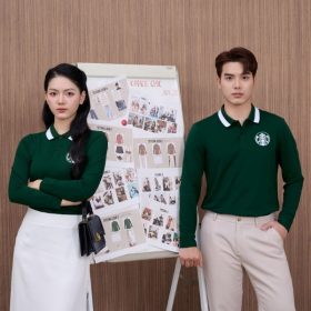 Gam xanh ve chai là tông màu chủ đạo gắn liền với hình ảnh thương hiệu Starbucks, tạo cảm giác gần gũi và dễ nhận diện. Chi tiết viền cổ màu trắng được phối khéo léo giúp tổng thể áo trông hài hòa, không đơn điệu. Logo được thể hiện rõ ràng trên nền áo, góp phần tăng tính đồng bộ và giữ đúng tinh thần thương hiệu khi sử dụng làm đồng phục.