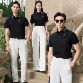 Màu đen của áo polo đồng phục mang lại cảm giác bí ẩn, cuốn hút và đầy khí chất cho người mặc. Đây là gam màu vừa có chiều sâu vừa tạo nên sự cân bằng, dễ dàng phối hợp với nhiều trang phục khác nhau. Sự kết hợp khéo léo với đường viền trắng ở cổ và tay áo giúp đồng phục công ty thêm điểm nhấn tinh tế, tạo nên nét khác biệt và cá tính riêng.