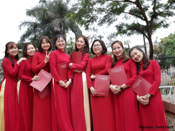 Áo dài là một trong những mẫu đồng phục đặc trưng dành cho nữ cán bộ Agribank trong các sự kiện quan trọng, dịp lễ tết hoặc các hoạt động đối ngoại. Thiết kế áo lấy cảm hứng từ tà áo dài truyền thống Việt Nam, với các đường cắt may ôm nhẹ theo đường cong cơ thể. Phần cổ cao, tay dài kín đáo kết hợp cùng tông màu đỏ chủ đạo phối quần vàng không chỉ tạo nên sự trang trọng mà còn khẳng định rõ nét bản sắc thương hiệu ngân hàng.